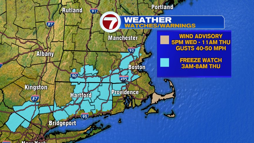 A wind advisory is in place for the Cape and Nantucket. Meantime, it’s a freeze watch that’s up for parts of the interior as lows run in the lower 30s there. Tomorrow night will be even colder.