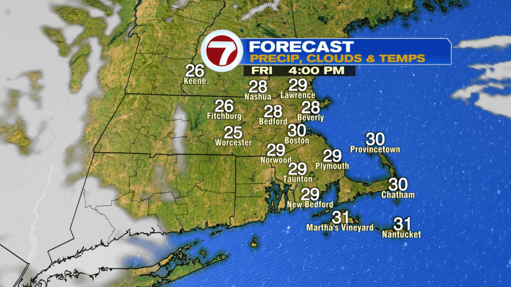 Temps drop off quickly late-afternoon/this evening as colder air comes crashing back in. By daybreak tomorrow, many of start the day off in the teens to near 20. Despite some sun, it’s a chilly day with winds gusting to 30mph and highs near 30.