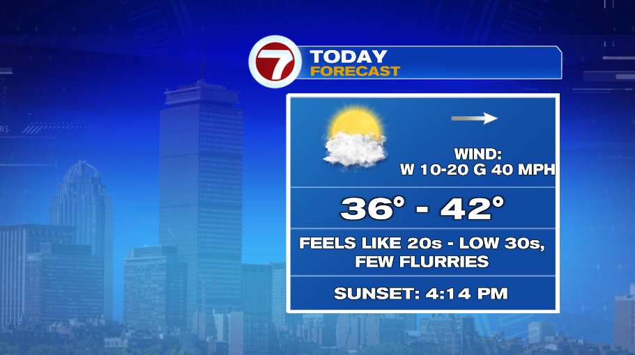 Cold air and a cold wind are the stories of today. If you’re heading out shopping today, definitely bring the hat and gloves. If you have to wait in a line outside, or take a long walk across the parking lot, it’s going to be cold! Air temperatures today will only make it to about 40° this afternoon but with winds that gust up to 40mph, it will feel like the 20s and low 30s through the afternoon. With the cold and gusty wind, you may see a couple of flurries, but that’s all it will be, a few flurries.
