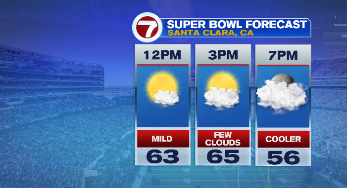 The Super Bowl city will start the day in the mid 40s with some sunshine, while temperatures peak in the mid 60s (during the game). By the 4th quarter, temperatures will fall back into the 50s, and clouds increase as well. Overall? A benign, even downright nice weather day for some football!