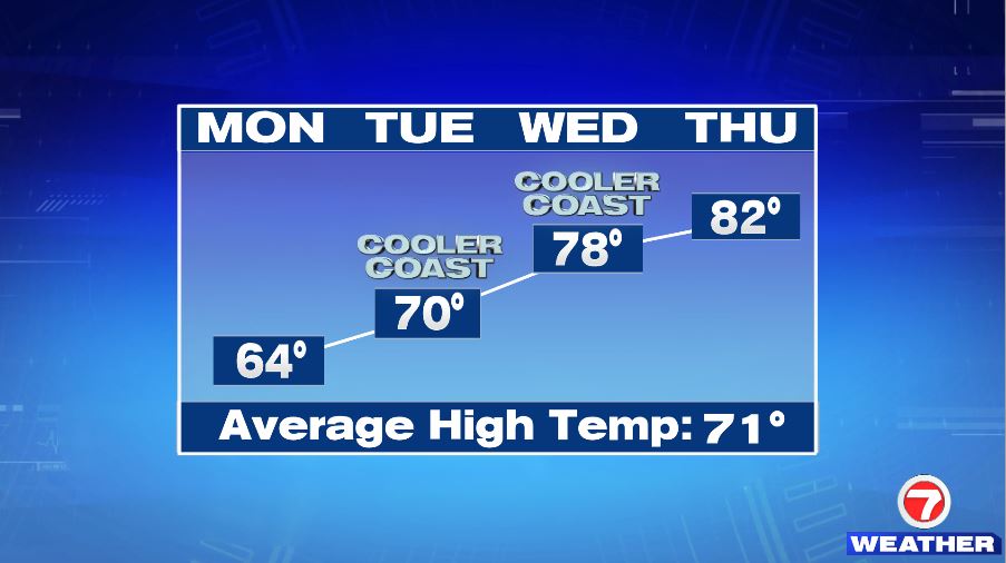 7Weather- The week starts cool, but then it gradually warms up back into the 80s by Thursday.
