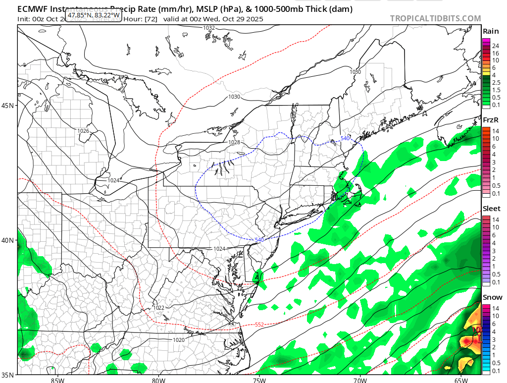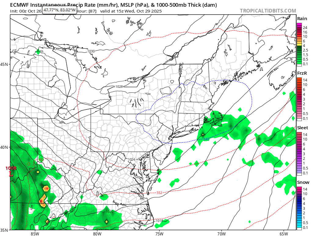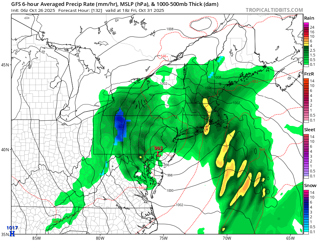 If you look above, you can see another area of low pressure on the western periphery of the Ohio and Tennessee River Valleys. That’s our next storm. It takes an inland track. Models have not been consistent with the timing and intensity. As of this morning, I think the storm will bring us rain and wind for Friday. Both the European and American models are on board with the idea. The American is the wetter solution this morning. Still there’s a lot that could still change before then especially with the timing.