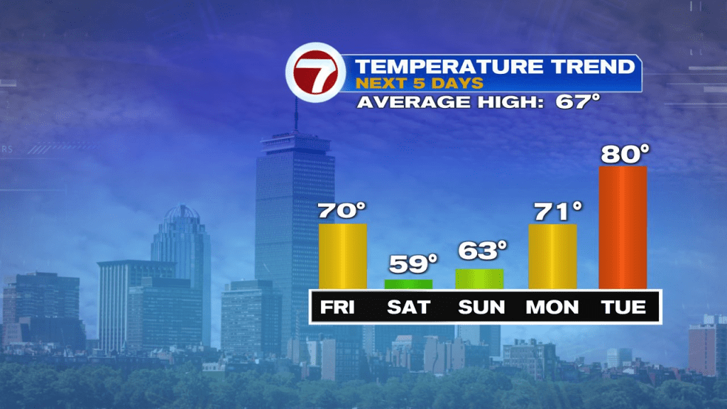 Of course, just like the last couple of weeks, once the weekend ends, so does the cooler air. We’re back to near 70 on Monday and another terrific Tuesday is in store as highs head for near 80 then. Ditto for Wednesday.