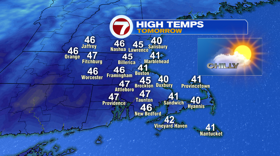Tomorrow is a colder day but we’ll keep the sunshine around. It will be a filtered sunshine with a veil of high cirrus clouds, but sunshine no less. The wind will be lighter, but will be onshore so that means cooler on the coast. Temperatures inland will climb to the middle 40s, while the coast hangs out near 40°.