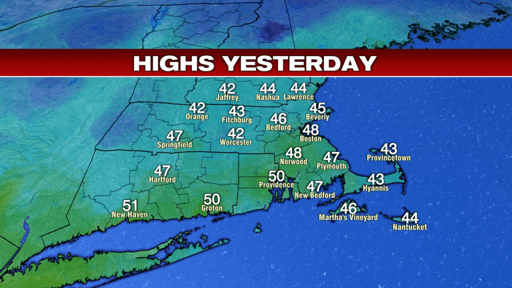 Today, we’ll track similar temps outside, but also feature increasing clouds and a bit of a developing breeze. Plus by the end of the day, some wet weather starts to move in. Before we get to that, we do deal with a chilly start with many towns starting near 20, certainly cold enough for that snowmelt and thawing ground to refreeze overnight. Watch for those icy spots this morning as black ice is an issue.