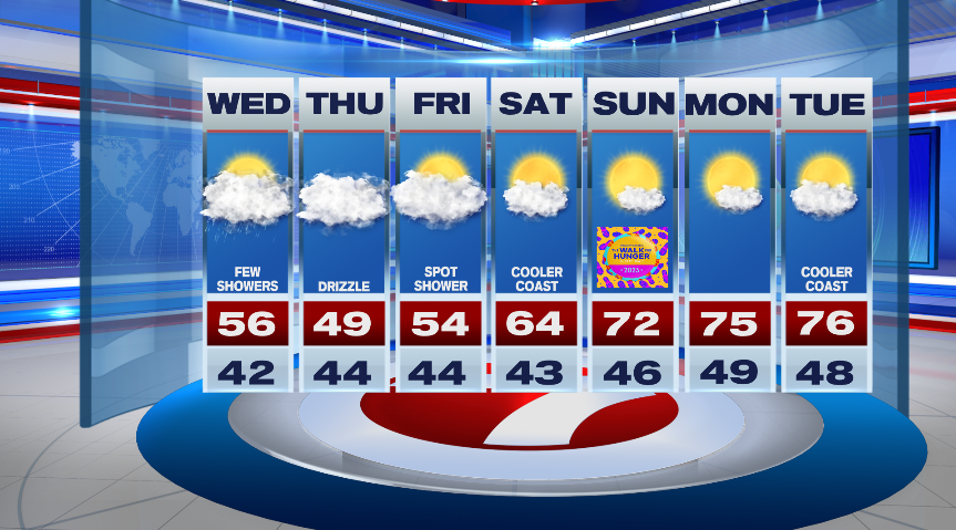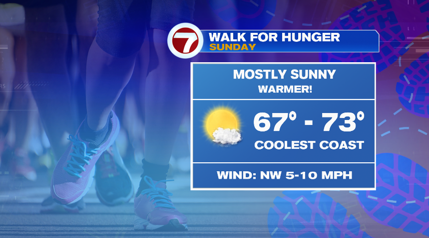 Our warm air and sunshine will return just in time for the weekend, which is great as Sunday is the Walk for Hunger! There’s more information on that walk on the top right corner of our homepage. But the weather looks outstanding with lighter wind, sunshine, and mild air returning.