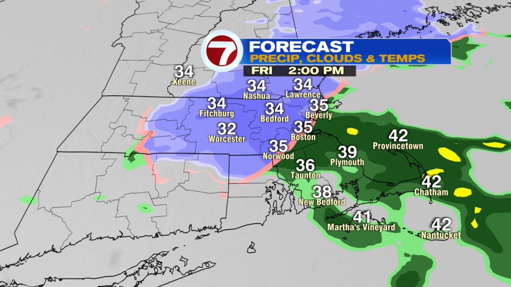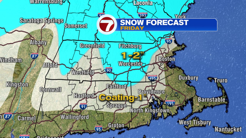 Tomorrow, it’ll be rain showers and snow that move through. While initially, the snow is most likely across the higher terrain early on, as a wave of low pressure slides east, along the south coast of New England, the rain/snow line will come back east during the midday/afternoon hours. So even the lower terrain, near and northwest of I-95 will see some flakes fly. While not a big storm, a coating to a couple inches are expected.