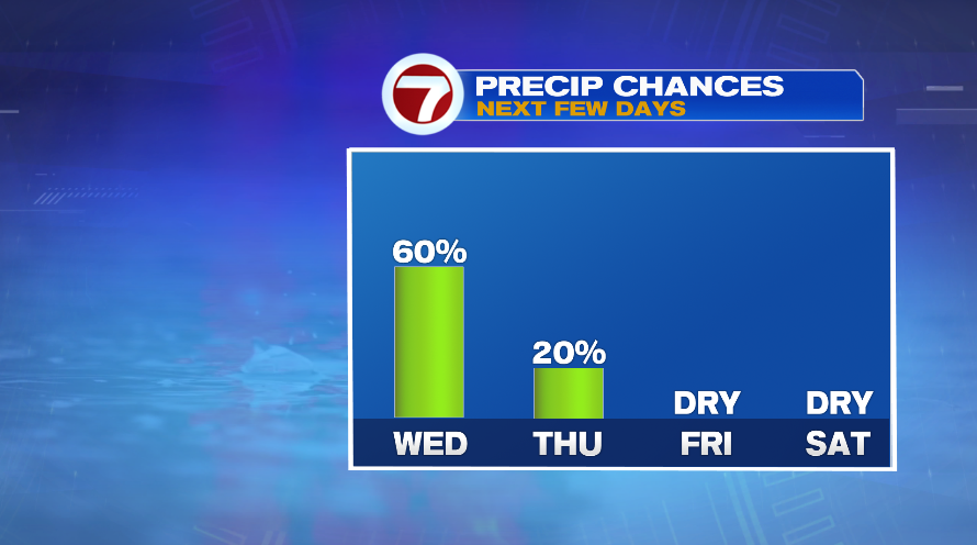 Tomorrow is a drier and much nicer day. It’s still not 100% dry, but most of the day will be, and most of us will be. There’s a small chance of light, passing shower in the afternoon tomorrow. Other than that, it’ll be a bit breezy with numbers pretty close to where we should be this time of year.