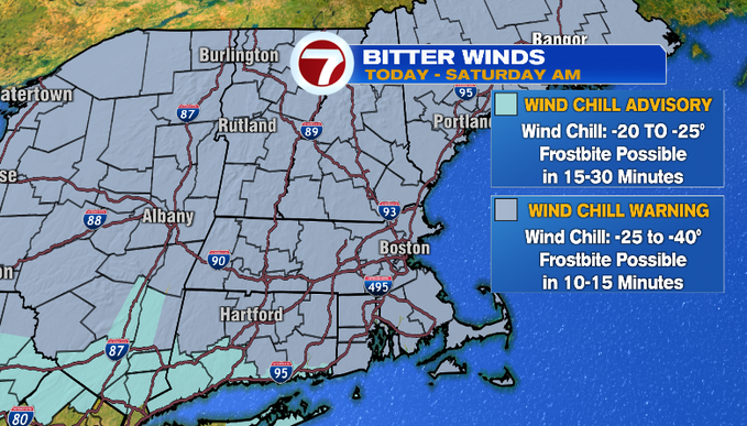 7Weather- Let’s jump right to it. It’s cold and overnight, the cold air and the gusty NW wind will combine to plummet wind chill values. There’s a Wind Chill Warning for the majority of New England through tomorrow morning. Wind chills will drop near -30 overnight. When wind chills are that low, it only takes 15-20 minutes for frostbite to set in. The best thing you can do is avoid time outdoors. If you have to be outside, dress in layers, especially covering your fingers, toes, ears and nose.