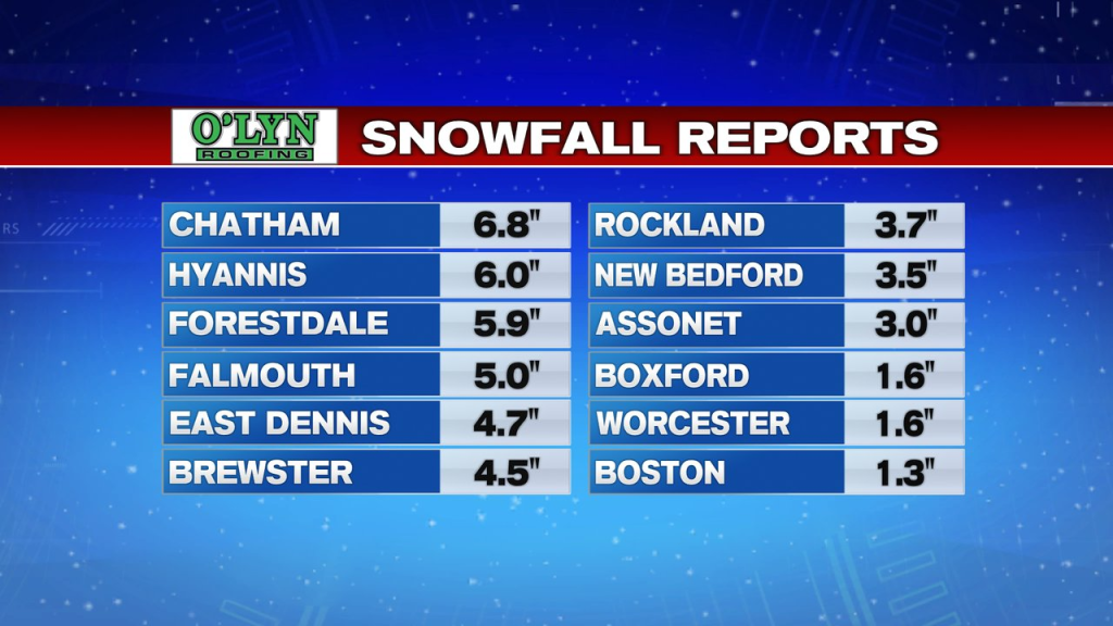 The first measurable snow is in the books for many as snow fell through much of Sunday across the area. The heaviest snows were near the immediate coast of the South Shore and across the Cape and Islands, where many spots picked up 3-6″ of snow. Below is a list of snow totals across the area, which includes the first inch of the season in Boston too.