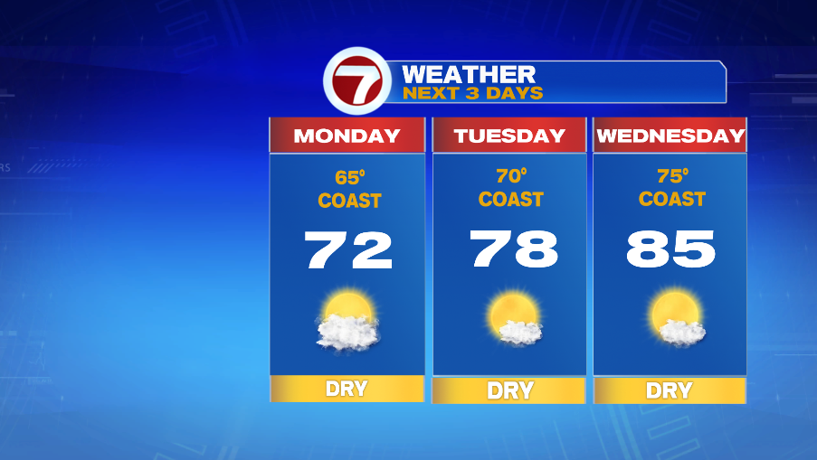 7Weather- What a weekend! Both days had some sunshine and temperatures in the 70s inland, and in the 60s at the coast. The week start with similar weather. Monday will start chilly early, but then we’re back to mild temperatures by lunch time. Highs will be in the low 70s inland, and in the mid 60s along the coast. There could be low clouds/fog in the morning along the South Shore and on the Cape & the Islands.