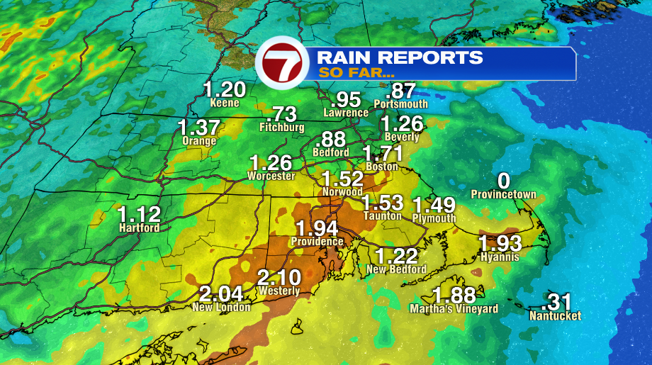 Those reports line up pretty well with radar estimates that show the heaviest rainfall on the 95 corridor between Boston and Providence. Although everyone across the state had a soaking rain, picking up at least an inch for most of us.