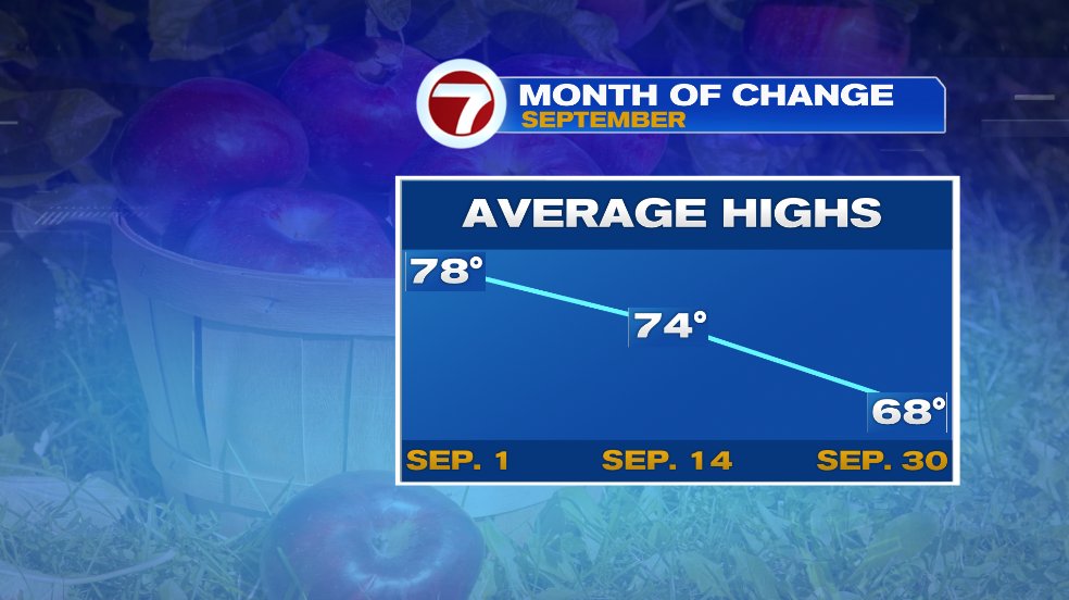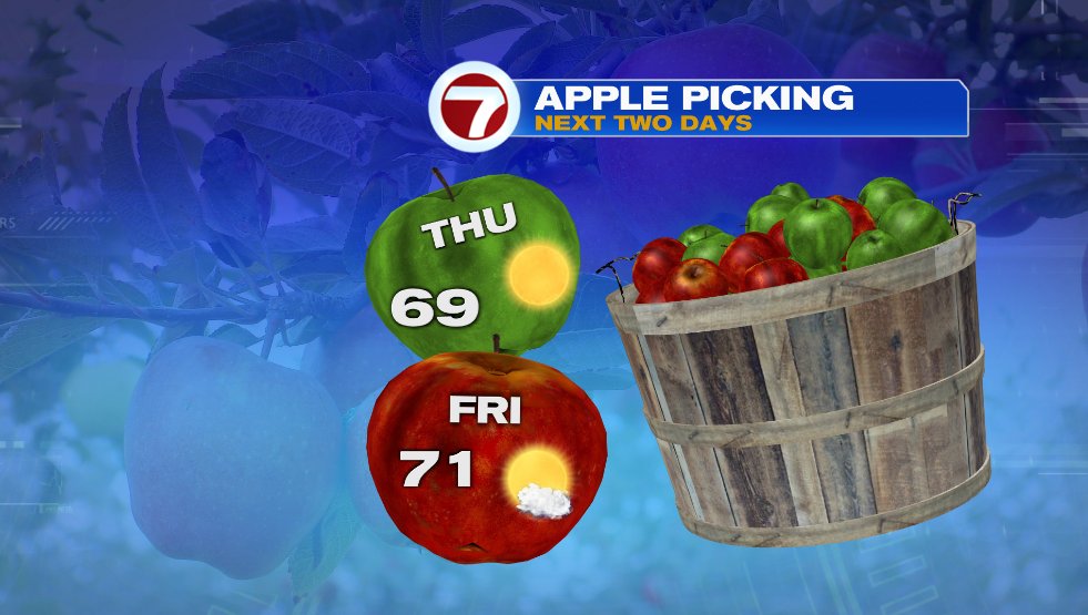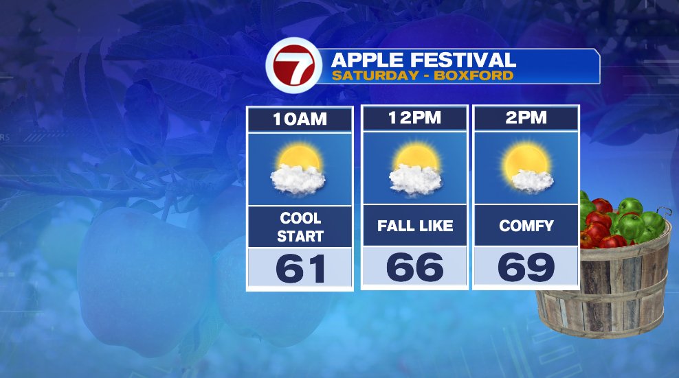 Saturday will be similar but an outstanding fall day. We’ll still be in the low 70s for highs with sunshine and comfortable humidity. Great weather for any outdoor plans you have and especially one of the several fall events happening in southern New England — including Apple Festival in Boxford!