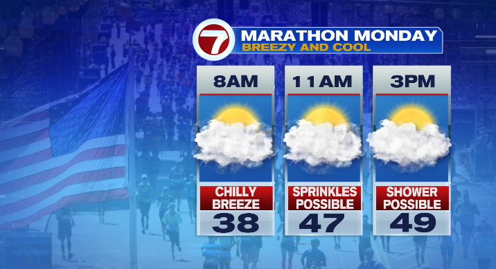 Now for the big-ticket item: Marathon Monday. This forecast definitely favors the runners over the spectators… but I suppose that’s the way it “should” be since they’re the ones who’ve put in the work! We’ll start the day chilly, with temperatures in the mid to upper 30s in the morning, and right around 40 degrees when the first wave kicks off around 9 AM. Highs will be in the upper 40s by the afternoon– runners certainly won’t have to worry about beating the heat as they head up Heartbreak Hill.