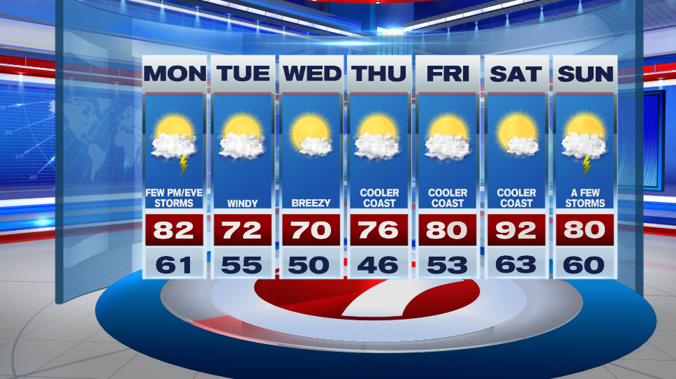 Tuesday and Wednesday are cooler in the low 70s. Humidity drastically drops and it will be breezy to windy. It warms back up throughout the week and we could see our first 90º day inland this upcoming weekend.