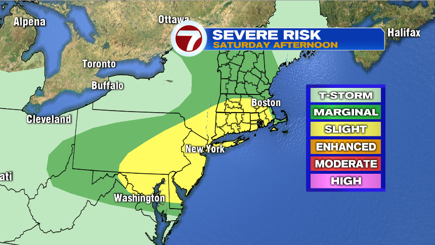 Saturday will be warm and humid. The day starts with a few showers early in the morning, and then there will be a dry stretch from mid-morning until the early afternoon. We likely see some sun in between, and that allows storms to fire up. A few storms could be strong to severe from 12-7 PM. The main concern will be gusty winds, and potentially hail. Highs reach into the low and mid 80s, and it will feel muggy.