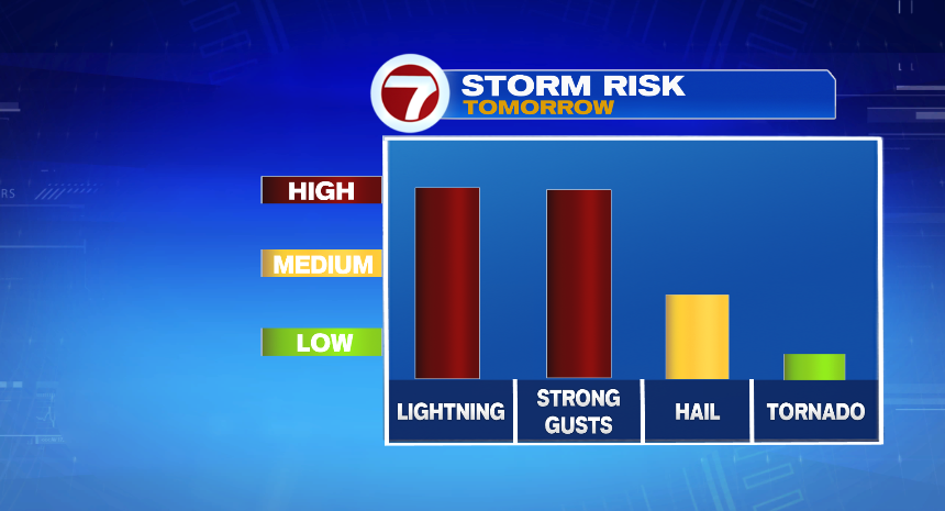 Sunday starts mostly cloudy and mild. The shower/storm chances goes up after lunch, and continues through the late afternoon. The severe weather threat is lower on Sunday. It won’t be as warm or humid, so the atmosphere won’t be as unstable, but there could still be an isolated strong storm. Highs are in the mid and upper 70s.