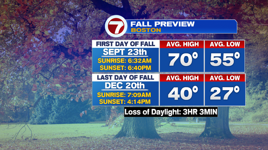 7Weather- Fall officially begins at 3:50 AM Monday, but it won’t feel like it. You’ll want to get an iced coffee, not a pumpkin spiced latte. The average high temperatures for the first day of fall is 70º, but most towns will be 15-20º above that.