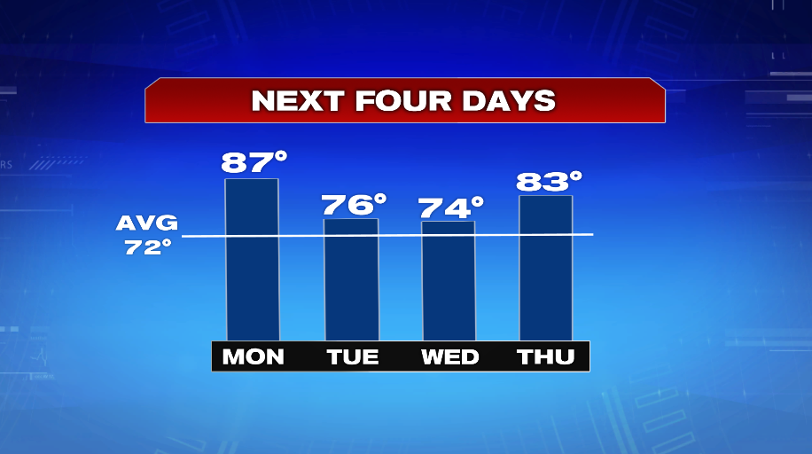 The 70s are back Tuesday and Wednesday, but then we warm back up into the 80s on Thursday.
