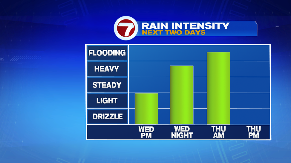 The heavy rain arrives around 10 PM tomorrow and sticks around all night. Rain will begin to pushout Thursday morning, but there will still be scattered tropical downpours in the area for the commute. With the continuing rain in the morning, there could be isolated flooded roads, especially those that typically flood. Rain ends from west to east between 11AM -2PM. We might even see sun by the later part of the afternoon.