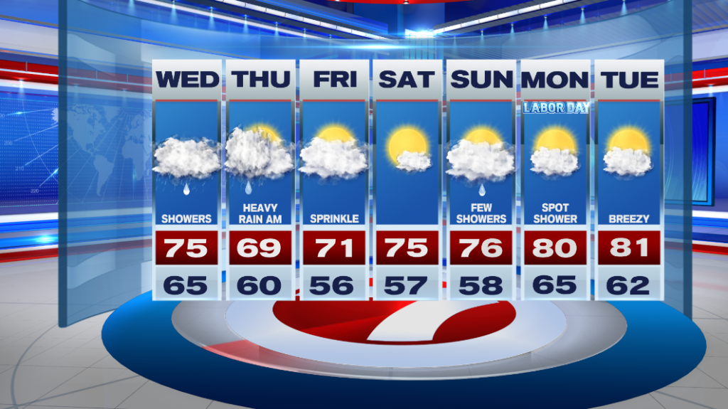 The remnants of Ida move out Thursday evening. Friday will have lots of clouds with sprinkles possible. Highs are in the low 70s. Saturday is a beautiful day with sunshine and temperatures in the mid 70s. It looks like Sunday now has a few showers, but it’s not a washout. Labor Day is partly sunny and there could be a spot shower.