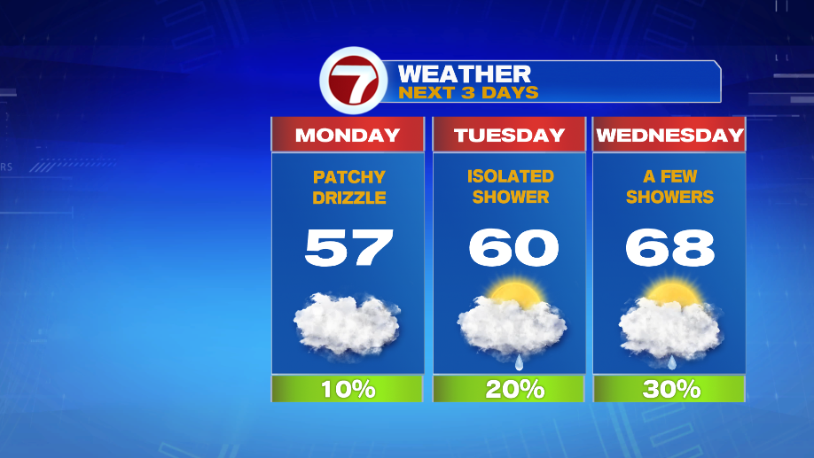 7Weather- We start the week gloomy after a 50/50 weekend. Monday will be cloudy with the chance for patchy drizzle. Temperatures range from the low 40s to the low 50s in the morning. Expect patchy fog along the coast.