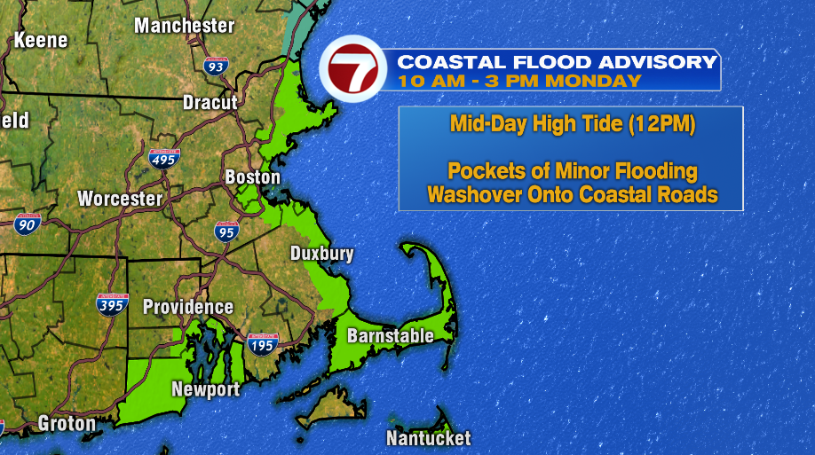 A Coastal Flood Advisory is in effect from 10 AM – 3 PM Monday. Waves may splash over onto roads along the coast, causing pockets of minor coastal flooding.
