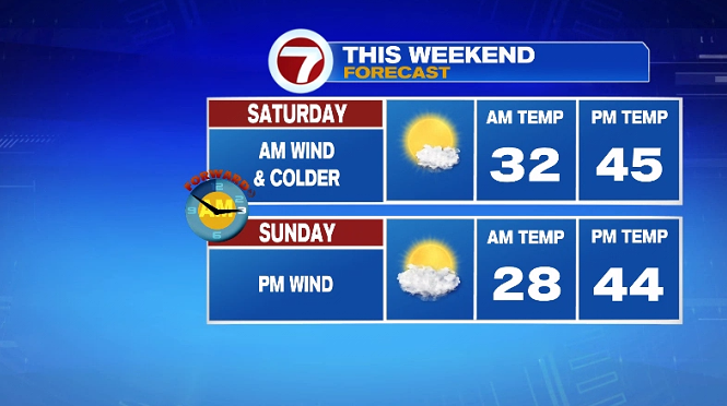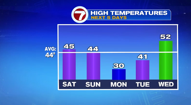 Seasonable temperatures return just in time for the weekend, with highs in the mid 40s for Saturday.