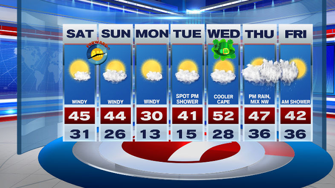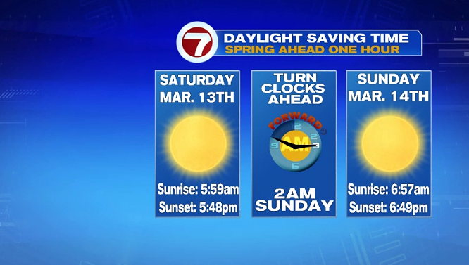 The weekend is dry and windy under a mixture of sun and clouds. Don’t forget to advance the clocks one hour before you go to bed Saturday night. Daylight Saving Time begins 2AM Sunday, “springing ahead” the clocks one hour. Although we lose an hour of sleep, we get later sunsets! Sunset on Sunday is 6:49PM.