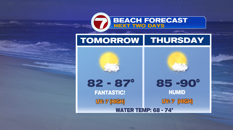 Tomorrow and Thursday are great beach days. Winds are light tomorrow, and the UV index is up to 7. That’s 30 min to sunburn. Temperatures at the immediate coastline will be in the low and mid 80s. Thursday is a bit warmer and humid. Winds are also light and skies are mostly sunny.