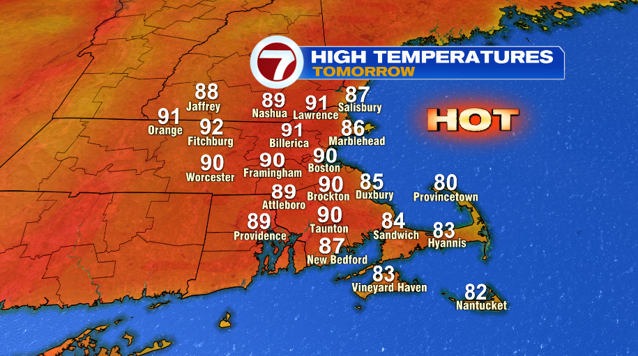 Temperatures will between 70-75º when you walk out the door tomorrow, and then we jump into the upper 80s by lunch time. The day will be mostly sunny and a bit humid with highs hitting into the low 90s. Winds will be light, so there could be a sea breeze that kicks in.