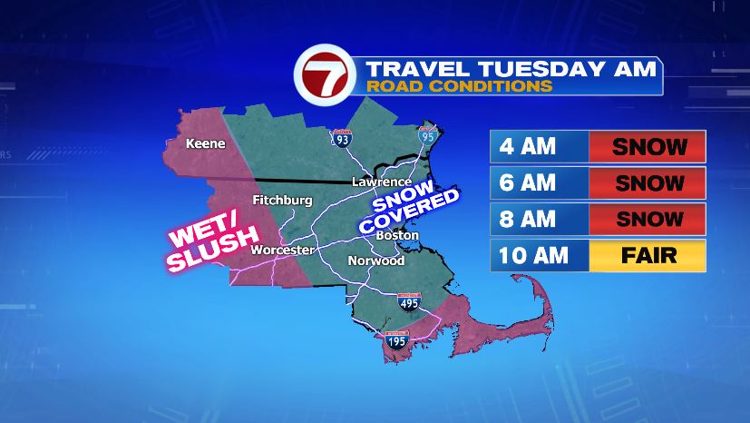 Travel for many of us will be worse for your Tuesday morning commute than either of the commutes on Monday. Snow to the northwest with gradually push down into Boston and southeastern Mass and change the rain back over to snow. Travel tonight will go downhill fast as roads become snow-covered for everyone.