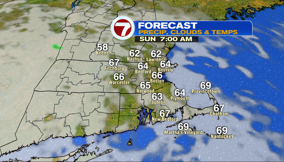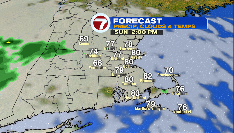 Sunday morning is mild in the low and mid 60s and it will feel a bit muggy. The afternoon has high, thin clouds and highs hit into the upper 70s and low 80s. Wind is light out of the west. It’s possible that a sea breeze does not kick in.