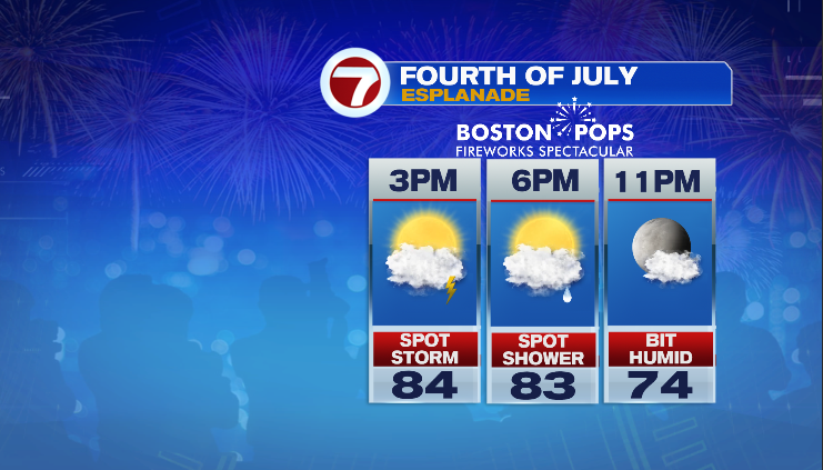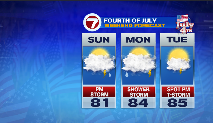 Sunday morning should be dry in spite of quite a few clouds. Monday starts with a few showers…then dry for several hours before seeing a few late day thunderstorms affect the region. Tuesday the 4th looks to be the best of those three days with just a few hit/miss afternoon thunderstorms. By Tuesday evening, whatever storms during the afternoon should fade away by sunset.