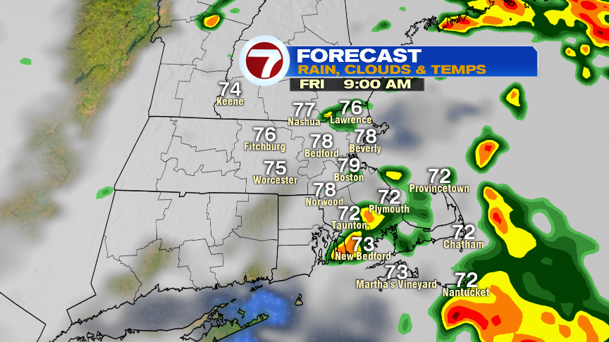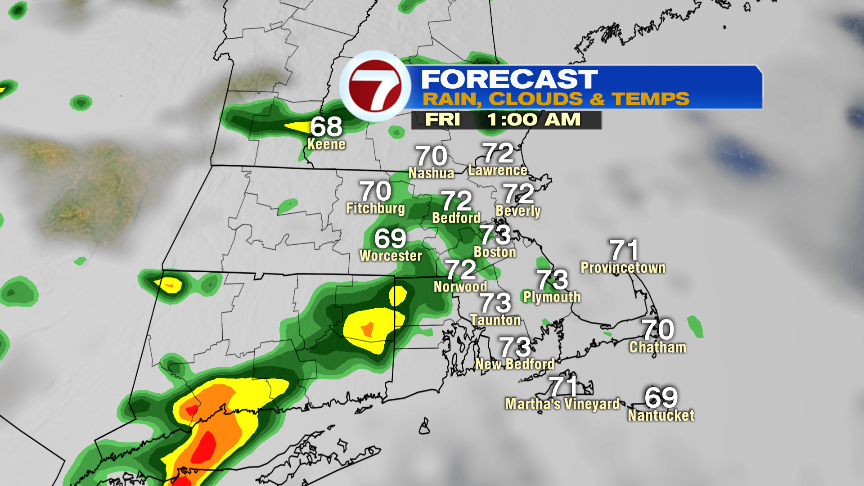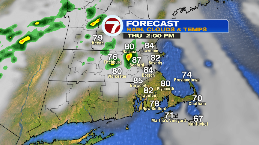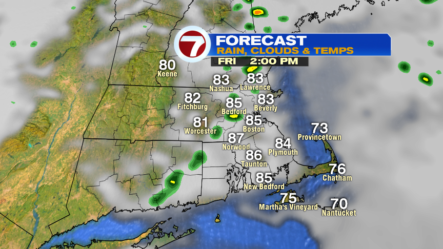 This afternoon, the best chance for a pop-up shower or storm will be northwest of Boston. Temps run in the mid to upper 80s.