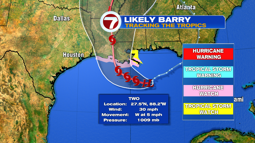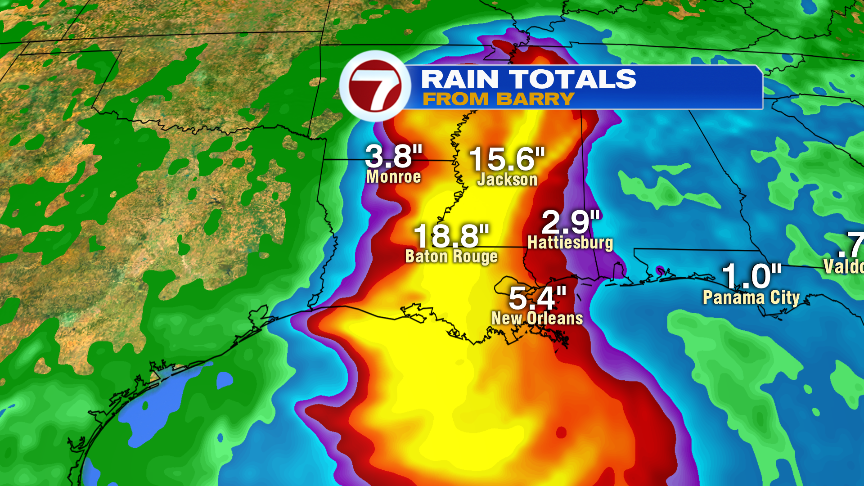 Meantime, in the tropics, the system that will likely become Tropical Storm, if not Hurricane Barry, will approach the Louisiana coastline late tomorrow. The most widespread risk with this storm will be flooding rains as 10-15″, locally up to 20″, is expected near the track. That rain, combined with a storm surge, and the Mississippi River already running high, will place many towns and cities, including New Orleans, to potentially significant/major flooding.