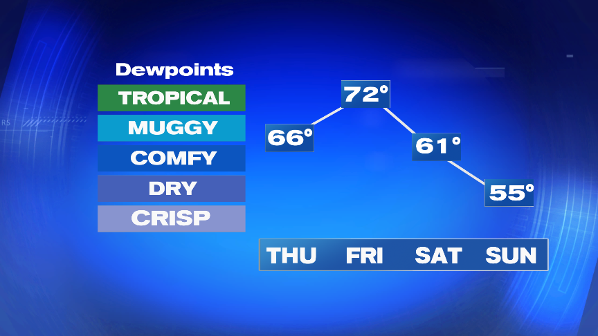 By tomorrow afternoon, storms are isolated, meaning we’ll catch plenty of dry hours too. Humidity will still be high until Saturday, then dew points slide down, especially by the second half of the weekend.