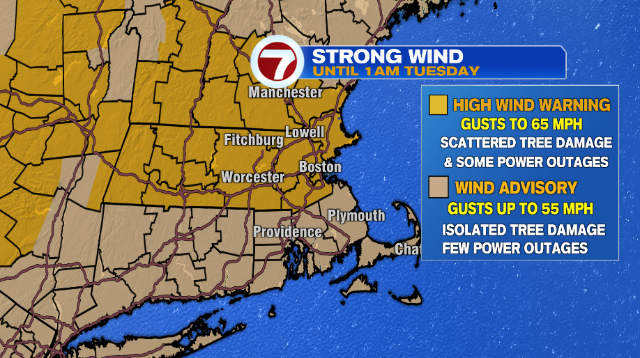 We have a high wind warning in effect for much of Massachusetts and southern New Hampshire for wind gusts that could exceed 60 mph today. There’s a wind advisory in effect for Plymouth and Bristol counties, and the Cape/Islands. This type of wind speed alone would be good enough to cause some damage, especially in the high wind warning, but the added problem may be a little left over ice or crusty snow stuck to the tree limbs and power lines. That added little bit of weight will go a along way in addition to this type of wind.
