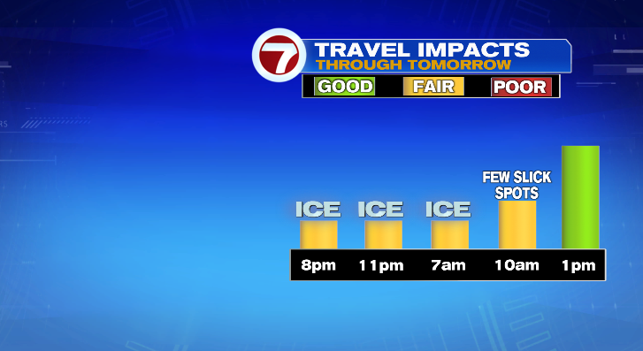 The freezing rain and rain showers will be spotty overnight, but the worst of the ice accumulation will occur in the hills.
