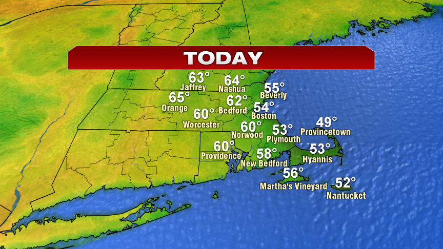 Despite the cloudy start to the day today, some sunshine will break out this afternoon with highs heading for 60+ inland, but holding in the 50s along the coast with a east to northeast wind. Clouds will hang toughest across coast Southeast Mass, especially the Cape and Islands, where it may take until mid to late afternoon to catch some rays.