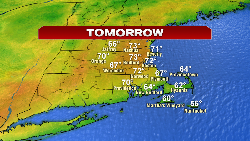 Tomorrow, the milder air is more widespread across the area with temperatures running 70+ for many. We’ll catch partly sunny skies for a while as well, but heads up mid to late afternoon, as a few showers and storms are possible in the 3-8pm time frame. Earliest northwest, latest south of Boston.