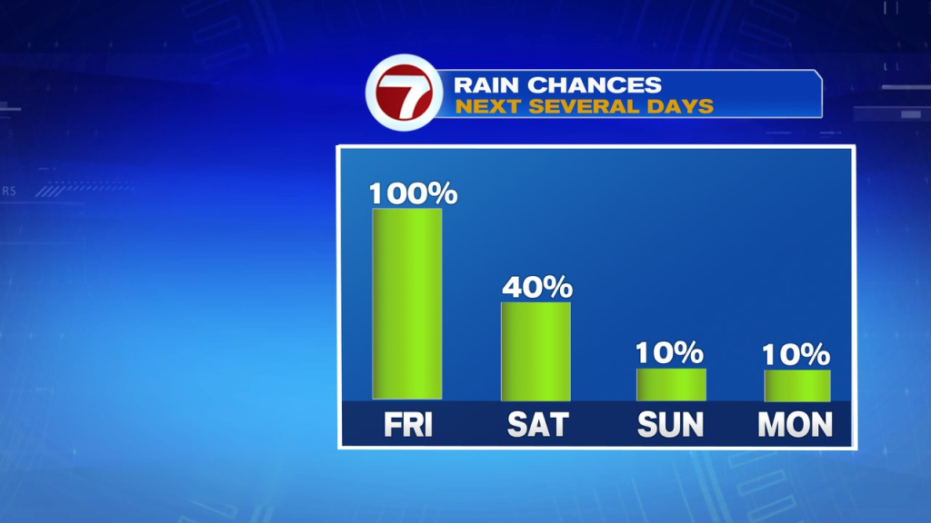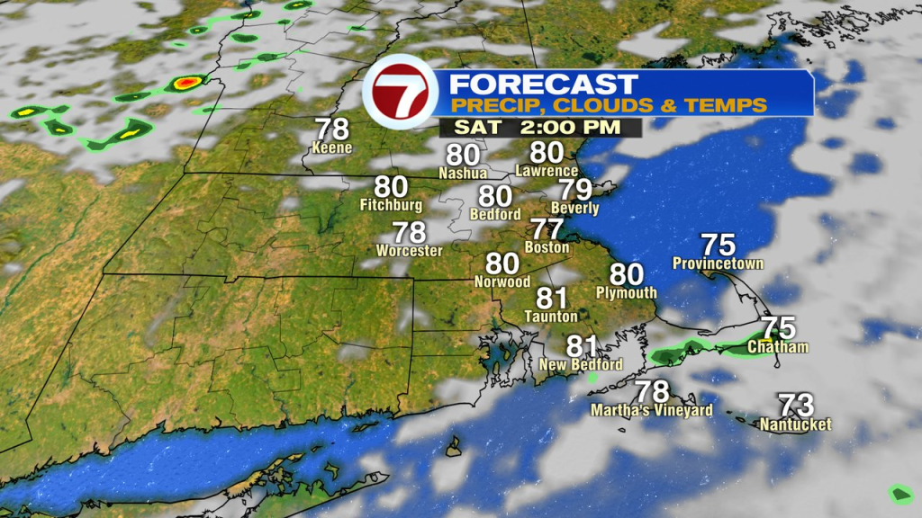 We’ll see some improvements Saturday as some sun breaks through the clouds from time to time. That’ll send temps up to near 80 and with dew points near 70, it’ll be a warm, summery day with high humidity. The warmth and humidity will increase the instability, allowing for scattered showers and storms to fire. They be hit or miss, so not all towns will see them, and even if you catch some wet weather, large portions of the day feature dry hours.