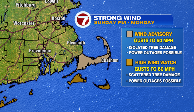 The strongest wind will be for the Cape and Islands. There’s a Wind Advisory for the Cape where gusts could be up to 50 mph. A High Wind Watch is in place for the Islands where gusts could be up to 60 mph. Gusts in these ranges could lead to tree damage and power outages.