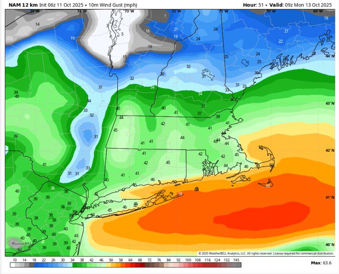 Moving on to the wind component. It will be breezy tomorrow. Gusts pick up by Sunday night. Some of the strongest wind could peak Monday morning. I think gusts could be near 40 mph inland. You’ll want to take the time now through tomorrow evening to bring in your Halloween decorations and secure your boats in the marina.
