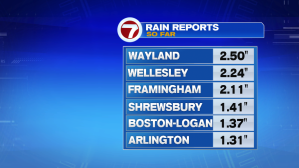 Rainfall reports from Metrowest were well over 2″ with Wayland taking the top spot with 2.5″ of rain.