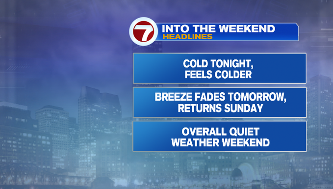 Saturday starts of cold near 10° and in the teens. With a lingering breeze, it will feel like the single digits for most, maybe even feel like below 0° for towns in Worcester County. We’ll see abundant sunshine as the wind becomes light. Highs reach the mid 30s. Great day to get outside!