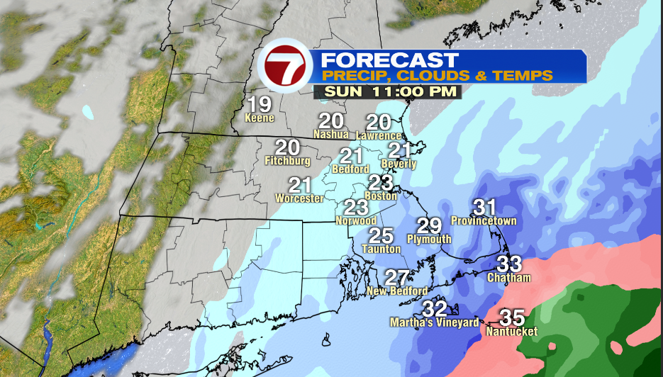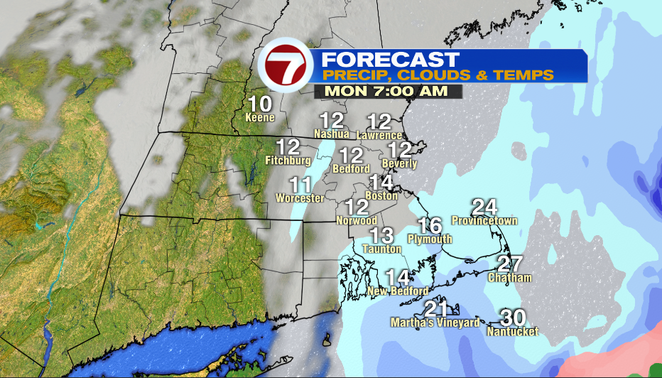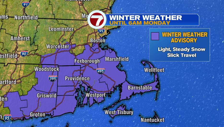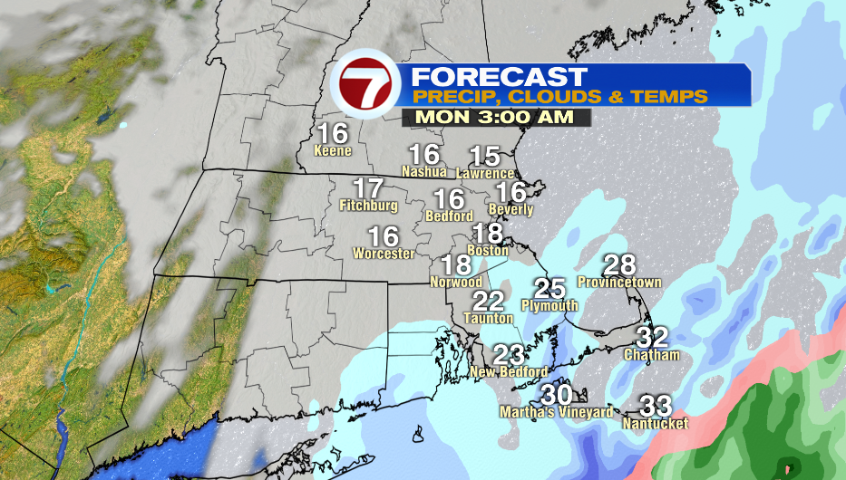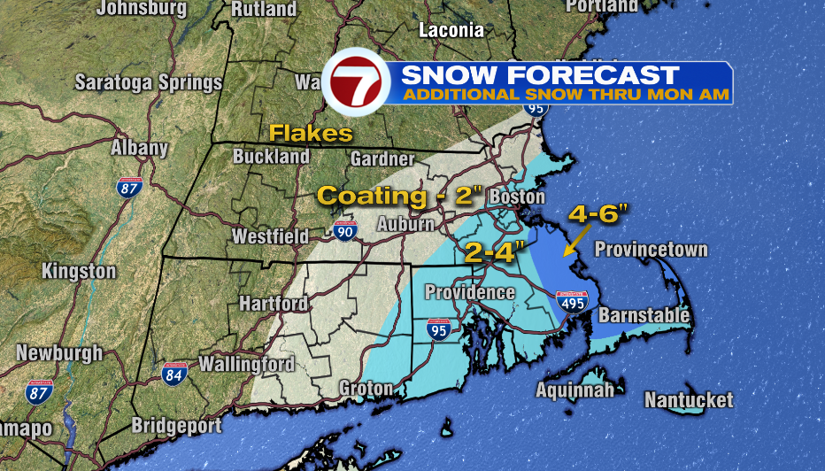 We’ll see light, steady snow now through 1-3 AM. After that snow will be patchy in most locations. It could remain steady on the Cape & the Islands until 6-8 AM. Plan on giving yourself extra time for the Monday morning commute.