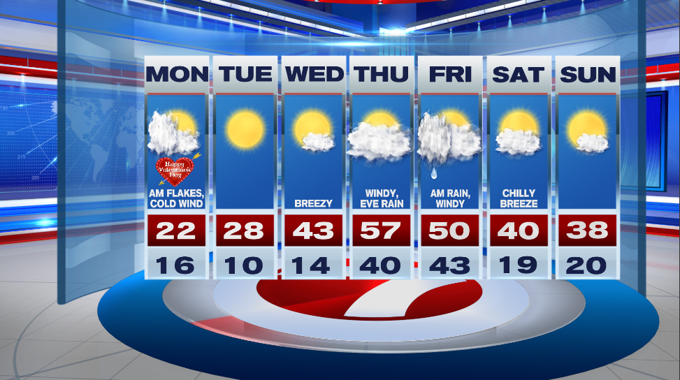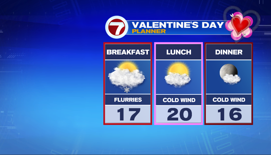 A cold wind will make it feel about 10 degrees colder than the actual temperature. Wear the winter jacket if you’re doing dinner for Valentine’s Day. Wind chills will be in the single digits in the evening.