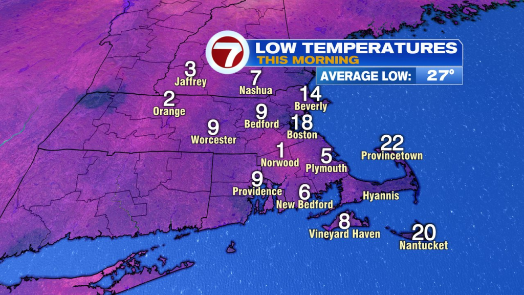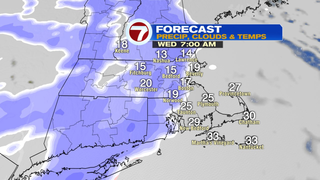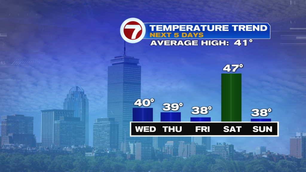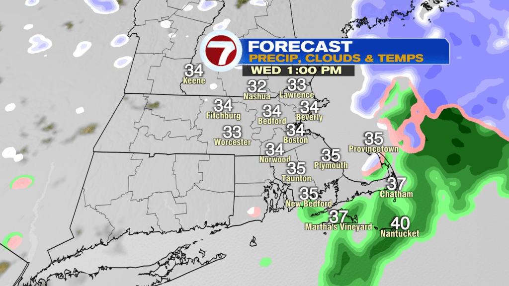 As snow tapers off, a southerly breeze pushes temps into the mid 30s to lower 40s this afternoon. Tomorrow will be seasonable, upper 30s. A storm to our south, slips south of us with just a little bit of light snow possible tomorrow night across the Cape/Islands.