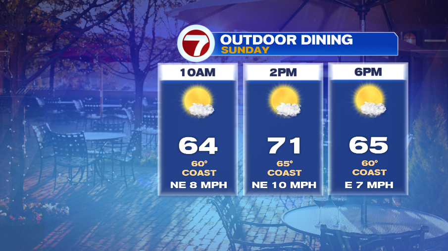 7Weather- Sunday is another beautiful day, but it will be slightly cooler compared to Saturday. It will be chilly early in the morning, and then it’s cool for brunch with temperatures in the mid 60s inland, and near 60º at the coast. Temperatures are in the low 70s for a late lunch and it will be breezy at times near the coast. We drop back down into the mid 60s for dinner and there will be a few clouds around. The day starts mostly sunny and then it becomes partly sunny in the afternoon.